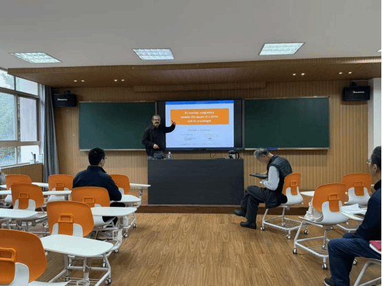 报告中,Michael J. Schlosser教授以拉马努金经典公式为引,深入阐释了素数平方模下本征同余式及其q-模拟的核心理论。他系统介绍了通过5-分拆从分拆生成函数中得到的特定q-级数系数同余性质,解析了同余式与q-级数在数论研究中的核心地位。教授重点推导了适用于幂级数的奇素数平方模本征同余式,结合具体案例展示了其q-模拟的构造逻辑与应用价值,为在场师生呈现了数论与组合数学交叉领域的前沿研究路径。