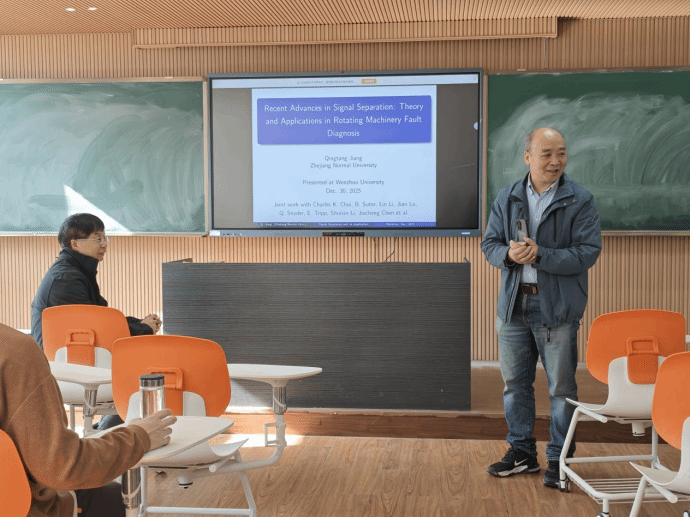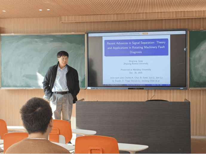 为促进学院学风教风建设,浓厚学术研究氛围,拓展师生学术视野,促进师生科研进步,我院自 2020 年开始建设 “数理大讲堂” 平台,定期邀请校外专家学者来校交流。2025 年 12 月 30 日上午 10:30,应我院高利新教授邀请,浙江师范大学杰出教授蒋庆堂在数理学院 3B205 学术报告厅作题为《Recent Advances in Signal Separation: Theory and Applications in Rotating Machinery Fault Diagnosis》的学术报告。本次学术报告是温州大学数理学院 2025 年第 21 期 “数理大讲堂” 活动,由我院高利新教授主持。