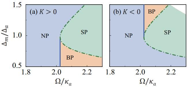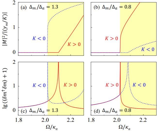 针对这一挑战,熊伟副教授与杭州师范大学张国强副教授等合作,创新性地提出在腔磁振子系统中利用磁振子克尔效应来实现非互易超辐射量子相变。该系统由参量驱动的微波腔与钇铁石榴石(YIG)球中的磁振子模式通过磁偶极相互作用耦合而成。研究团队发现,磁振子克尔效应的系数K的符号可通过调节YIG球的外加磁场方向进行精确控制:当磁场沿晶轴[100]方向时,K > 0;当磁场沿[110]方向时,K < 0。通过系统的稳定性分析,团队获得了系统的稳态相图,发现K > 0和K < 0两种情况下的相图存在显著差异,分别呈现出不同的临界阈值和相变类型(一级或二级)。进一步研究磁振子数及其量子涨落随参量驱动强度的变化,团队证实了超辐射量子相变的非互易性,并创新性地引入“双向对比度”参数对非互易行为进行了定量刻画。