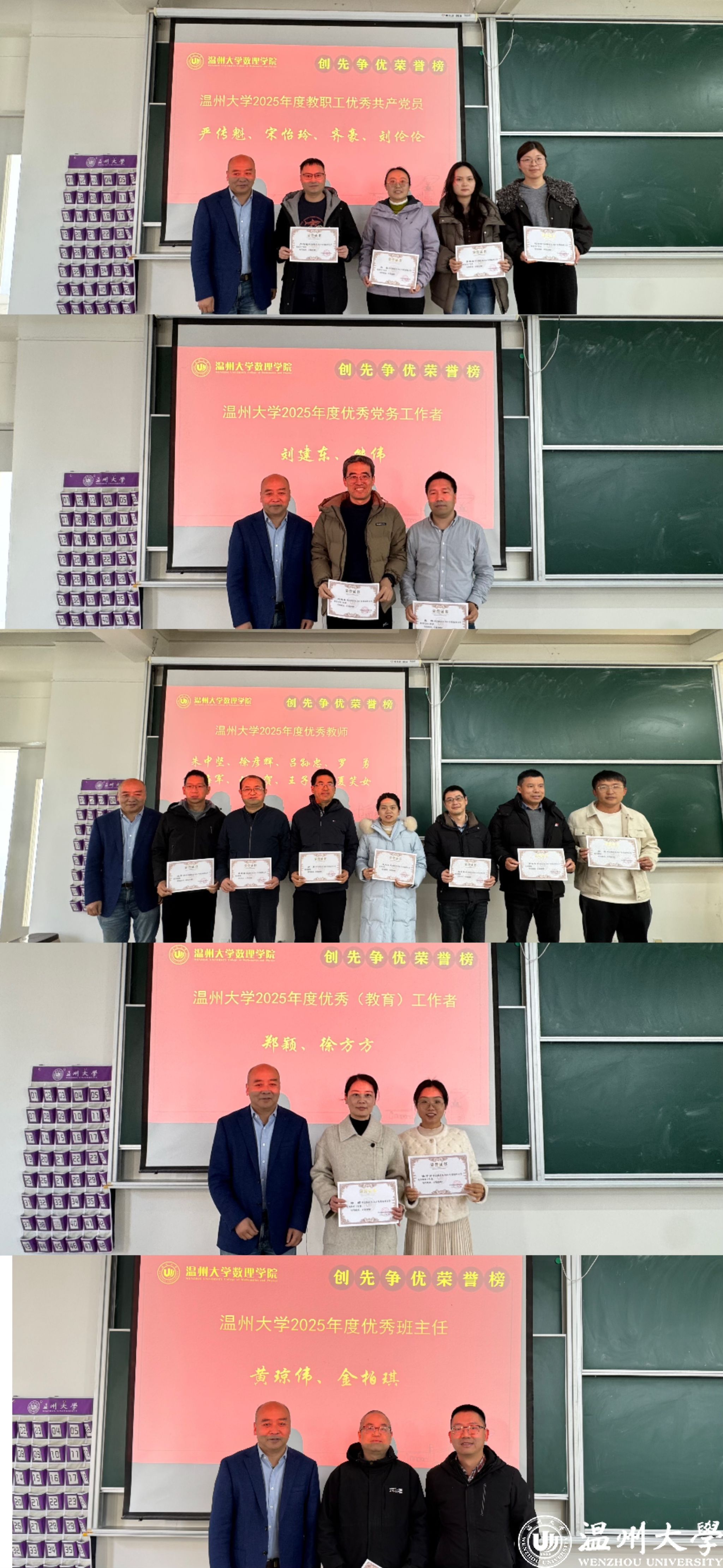 会议伊始,举行了气氛热烈的2025年度表彰先进仪式。高利新院长为荣获2025年度校优秀共产党员、校优秀党务工作者、校优秀教师、校优秀教育工作者、校优秀班主任荣誉称号的教师们颁发荣誉证书,并代表学院向受表彰的个人表示热烈祝贺。高院长寄语全体教职工,希望大家以受表彰的同仁为榜样,立足岗位、潜心育人、扎实科研,在新的一年里继续为学院发展贡献力量。