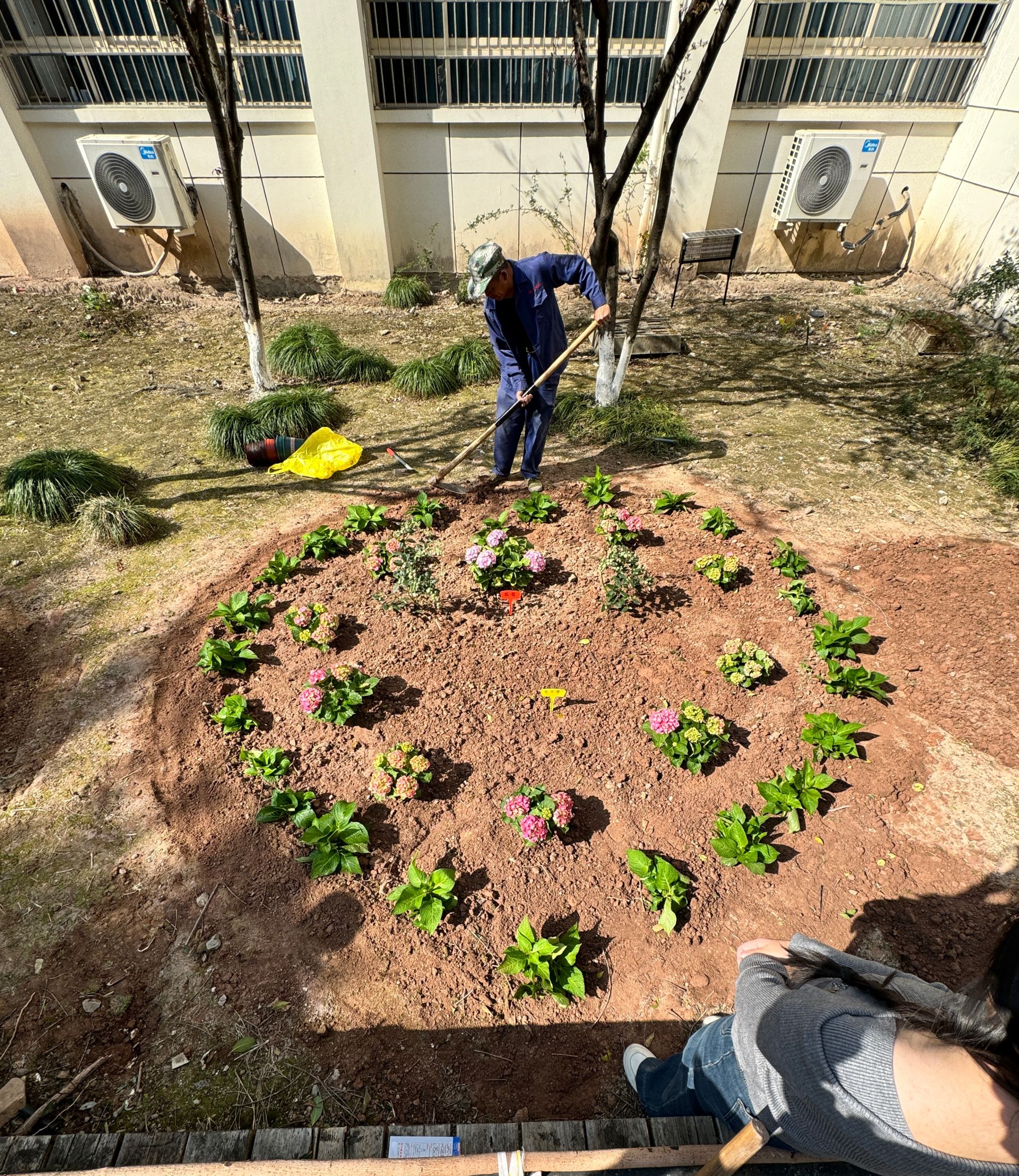 值得关注的是,同学们将所有花草的种植区域巧妙地勾勒成了一个爱心形状。待到花朵绽放之时,这件大地艺术作品,将成为校园里一道独特而亮丽的风景线,传递着青年学子对自然的敬畏、对校园的热爱以及彼此间团结协作的深厚情谊。