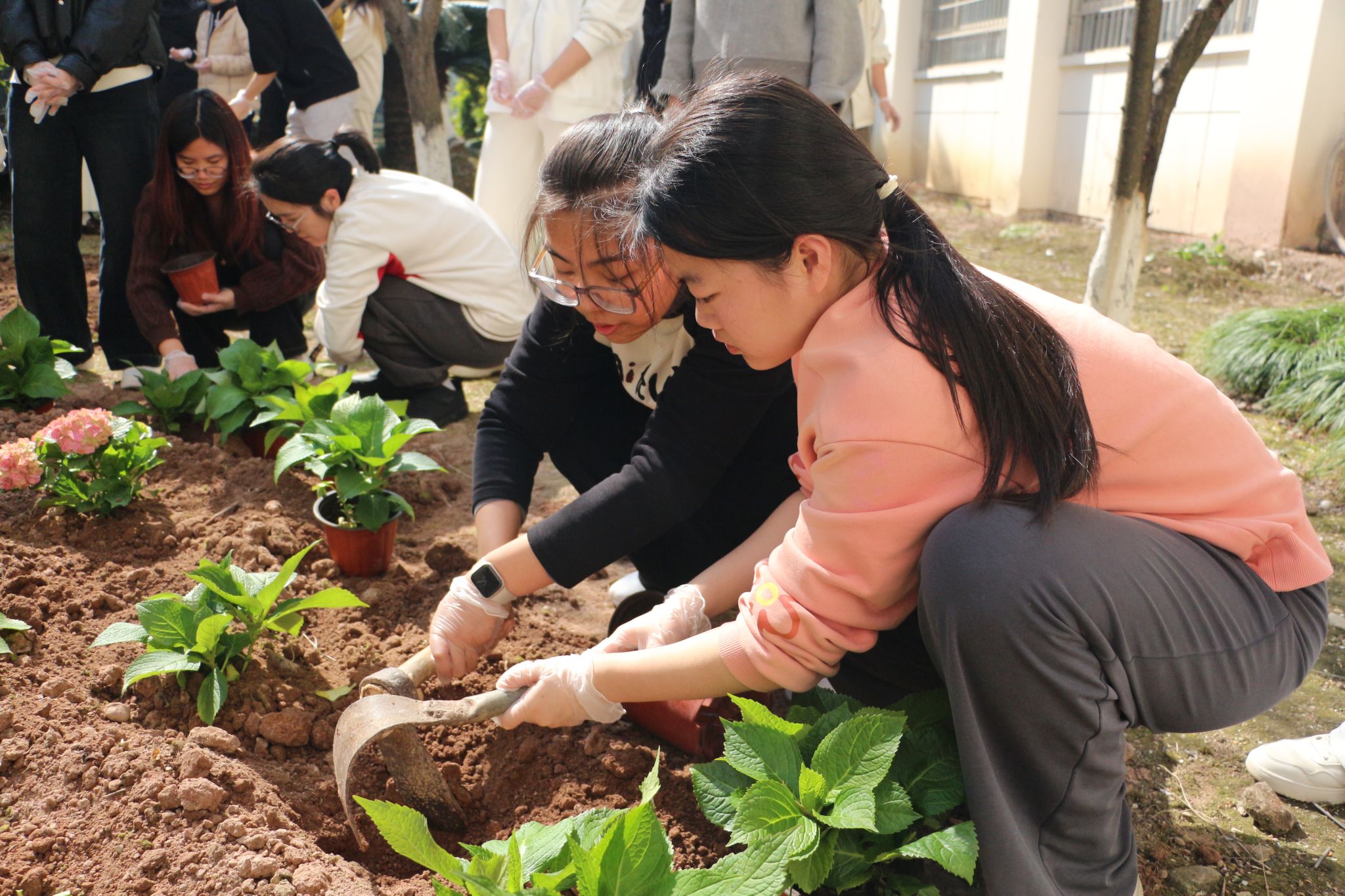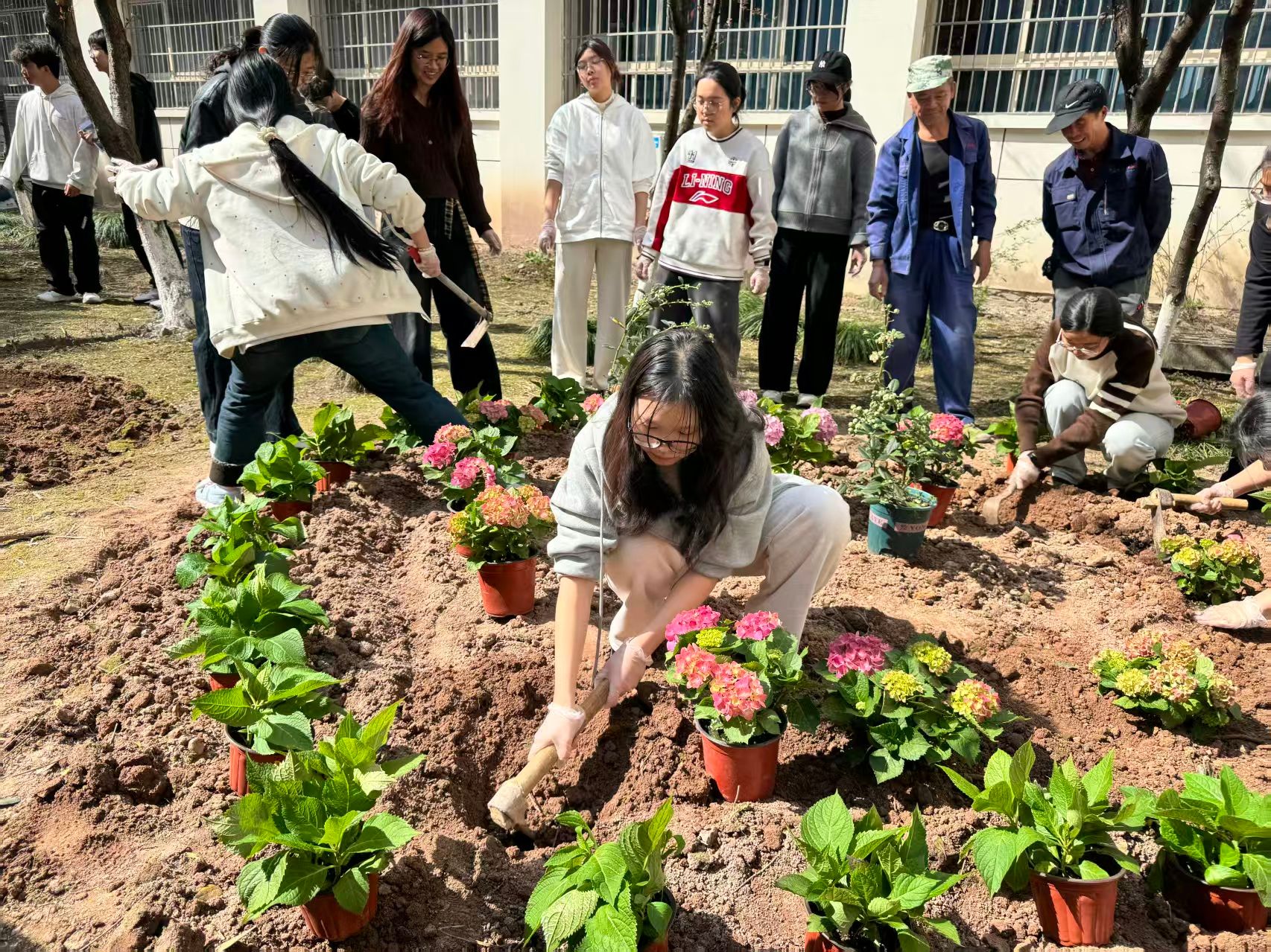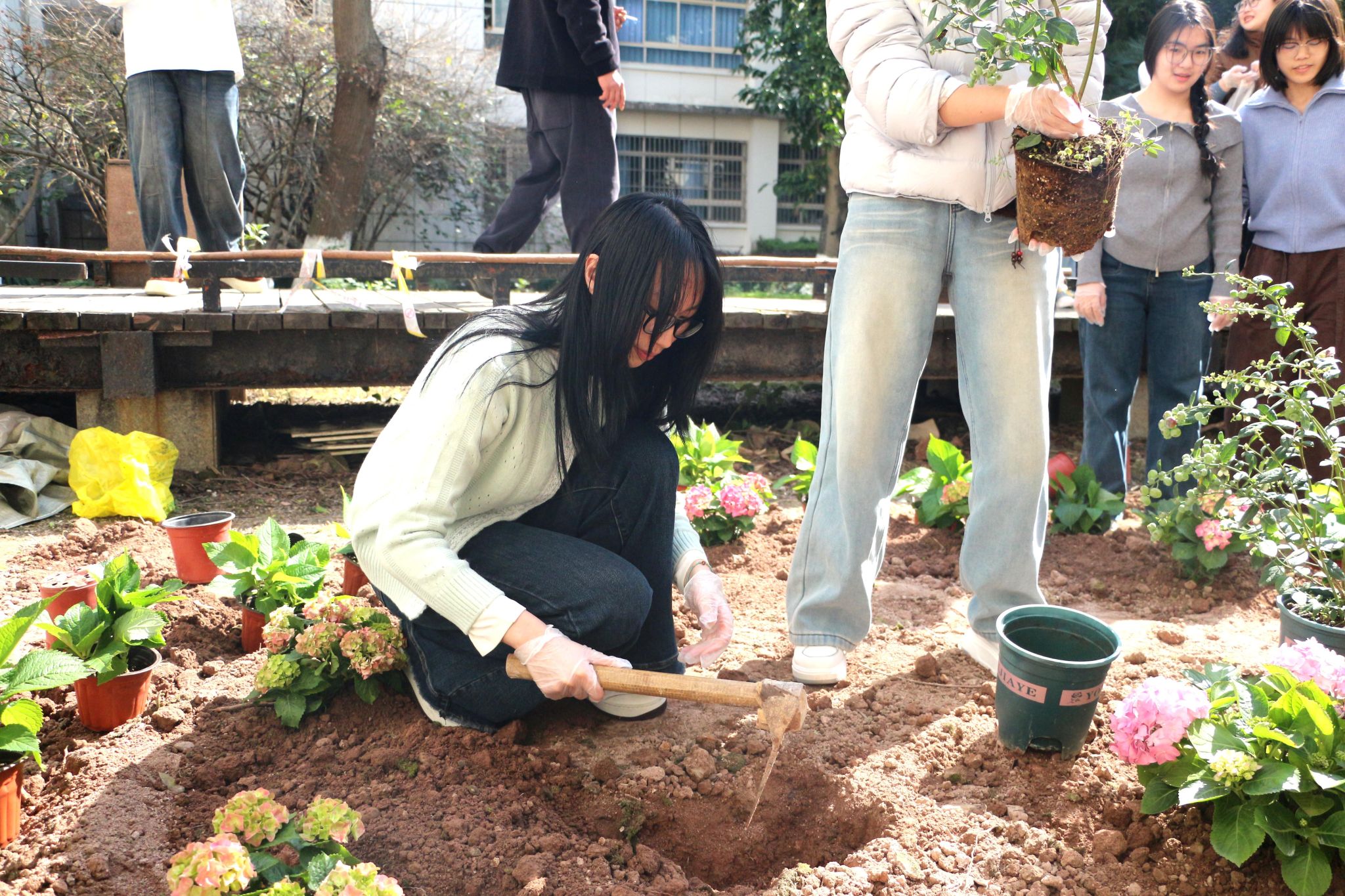 活动于下午2点准时开始。现场,同学们热情高涨,干劲十足。他们手持铁锹、水桶等工具,在专业苗圃园丁的示范和指导老师的带领下,分工协作,配合默契。大家小心翼翼地栽种下一株株绣球花和蓝莓幼苗,铲土入坑、扶正苗木、提水浇灌,每一个步骤都做得认真细致。随后,同学们又俯身于松软的土地,仔细播撒下波斯菊、百日草的种子,期待着不久后破土而出的盎然生机。