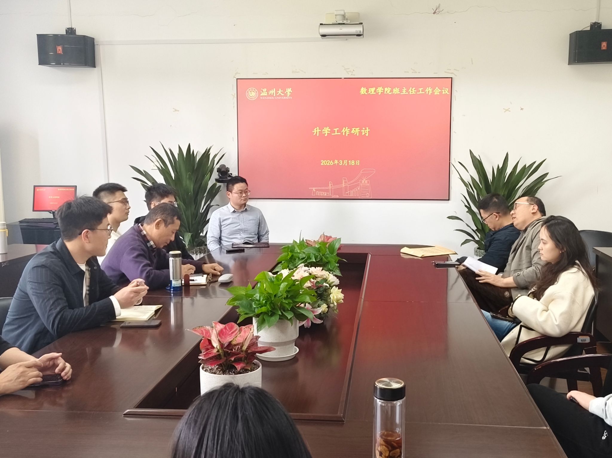 3月18日下午,数理学院班主任工作例会暨2026届毕业生升学就业推进会在学院会议室召开。会议由学工办副主任陈亮主持,学院党委书记陈兴桂、全体班主任及全体辅导员参加会议。