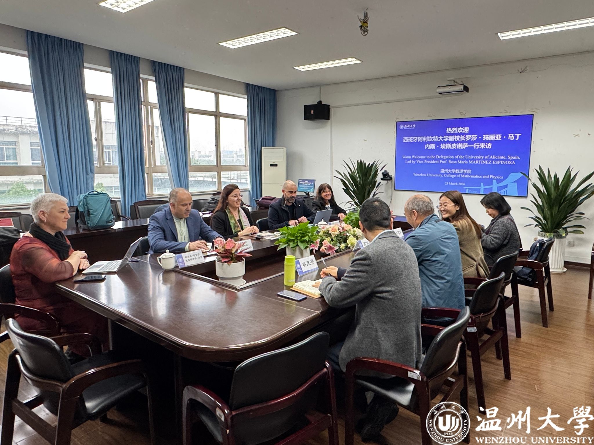 3月23日下午,西班牙阿利坎特大学国际关系与发展合作副校长罗莎・玛丽亚・马丁内斯・埃斯皮诺萨一行莅临温州大学数理学院访问交流。双方在3B406会议室举行合作交流会,围绕学生交换、硕博士联合培养等事宜进行深入洽谈。数理学院院长高利新、副院长蔡风景、统计与信息科学系主任黄辉林等参加座谈。
