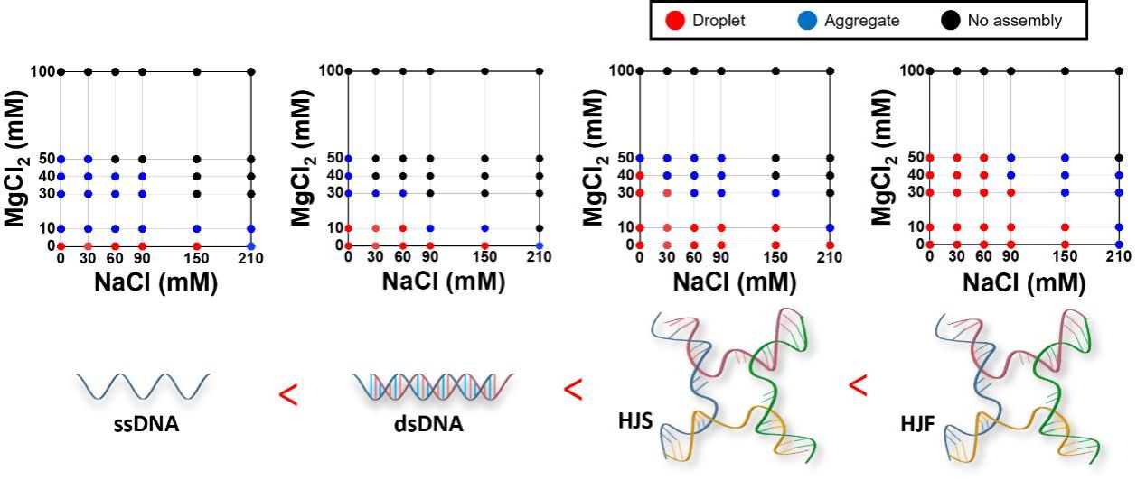 该研究聚焦DNA同源重组关键中间体——霍利迪连接体(Holliday Junction, HJ),与典型的IDR蛋白——组蛋白H1(Histone H1,H1)的相互作用。通过分析不同DNA类型在离子环境及H1作用下的构象动态与凝聚特性,发现具备结构特征的 DNA 对 H1 介导的液-液相分离具有更强促进作用,其能力呈现 ssDNA< dsDNA < HJS < HJF 的层级趋势(图2),说明 DNA 并非被动支架,其结构与序列特征能够显著影响蛋白质-核酸凝聚体的形成与稳定性。smFRET结果进一步表明,值得注意的是,这一动力学增强效应具有显著的离子依赖性:在低至中等浓度的Na⁺或Mg²⁺条件下效应最为突出;而在高盐环境中,由于静电屏蔽效应及竞争性离子结合,该促进作用明显减弱。该研究揭示了一种可离子调控的分子开关机制,通过HJ-H1的特异性相互作用,将DNA的结构特征与局部生物分子凝聚事件动态关联,为深入理解染色质结构调控、基因转录及DNA损伤修复等关键生物学过程提供了新的理论视角。