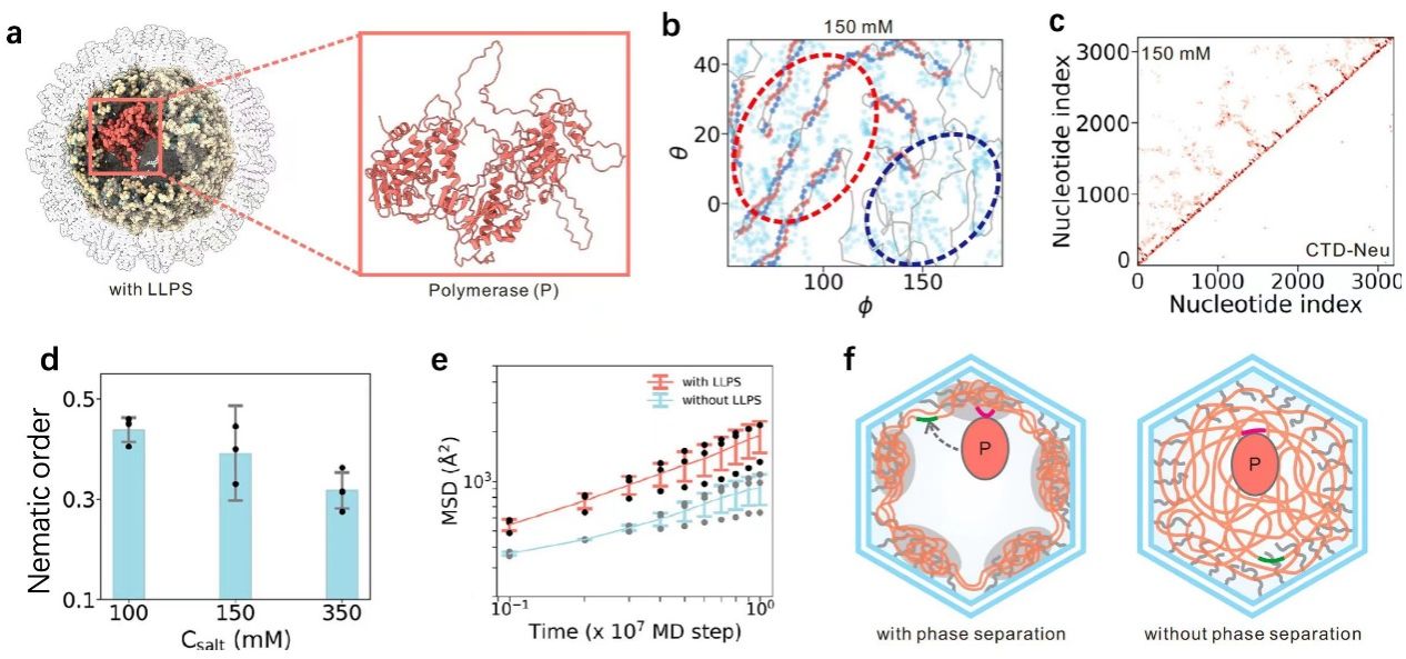 图1. 液液相分离形成的病毒基因组微相结构的结构有序性与动态柔性促进逆转录酶在受限衣壳内的扩散与基因组RNA长程碱基配对,加速乙肝病毒逆转录过程。