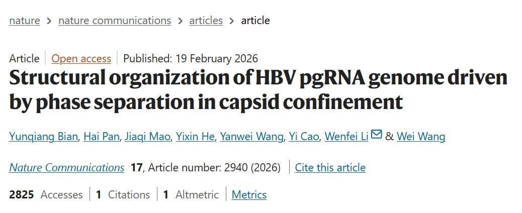 乙肝病毒是导致慢性肝炎、肝硬化和肝癌的主要原因,全球有数亿感染者,并导致每年约80万死亡病例。理解乙肝病毒的分子组装机制对开发抗病毒药物至关重要。乙肝病毒虽为DNA病毒,但在其生命周期早期,其前基因组 RNA(pgRNA)需要与聚合酶一起加载到病毒壳体中。由于RNA带负电且空间极度受限(几十纳米),基因组通常面临巨大的静电排斥力。研究团队通过多尺度计算模拟,并结合单分子和生化实验,发现pgRNA并非均匀地填充在衣壳内,而是利用液液相分离机制,在衣壳内表面凝聚组装成空心的球壳状液态凝聚体(condensates)。这种凝聚体呈现低密度区与高密度区共存的异质性特征。