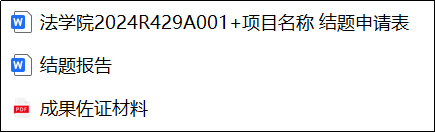 1、项目结题材料文件夹以“学院名称+项目编号+项目名称”规范重命名(例如“法学院2024R429A001+项目名称”,项目名称请与验收汇总表保持一致,不得变更),内含①结题申请表(附件1):电子版(WORD版本),其中需师生签字、学院盖章的页面请完成签字盖章后,将该页面扫描成图片插入表格相应位置,调整好格式与大小,表格整体需美观、协调。每个项目的经费使用情况已从计财处导出,会发至项目交流群。验收栏中专家组验收意见请学院结题验收核查小组填写即可;②结题报告;③成果佐证材料:每个项目的所有成果支撑资料整合成一个pdf文档。均提交电子版本。