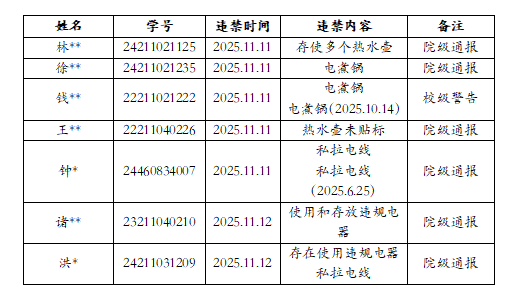 在学校近期开展的公寓安全排查工作中,发现有 7 位同学存在使用违规使用电器及私拉电线的行为,此行为违反了《温州大学学生管理规定》。依据学校相关规章制度,现对该同学进行院内通报批评(具体名单如下),并按照规定扣除其文明品行分。望全体同学以此为鉴,严格遵守校规校纪,共同维护校园安全。