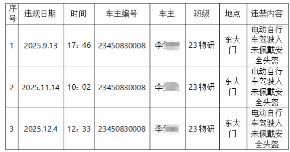 为切实保障学生出行安全,营造安全有序的校园环境,学校及学院多次强调骑行电动车、摩托车需规范佩戴安全头盔的相关要求。但近期核查发现,我院 23 级物理学研究生李**(学号:23450830008)同学,在校园内骑行电动车时分别于未按规定佩戴安全头盔,该行为违反了校园交通安全管理相关规定,存在极大安全隐患,也未起到学生应有的示范作用。