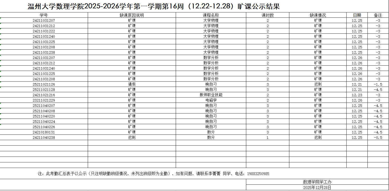 附件【温州大学数理学院2025-2026学年第一学期第十六周(12.22-12.28)旷课公示结果.xlsx】已下载次