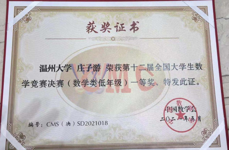 “全国一等奖的含金量非常高。”据该校数学系于恒国老师介绍,去年12月举行的浙江赛区选拔赛,是按参赛学生所在学校是否双一流分为A类B类,但进入决赛后,参赛选手就混在一起同场竞争了,从20多万名初赛选手中选拔出来的600名选手,按数学类高年级组、数学类低年级组和非数学类组等3个组别进行决赛。庄子游分在数学类低年级组,从颁奖典礼上公布的获奖名单和荣誉证书编号来看,他的决赛成绩紧随北京大学选手之后,名列全国第18位。