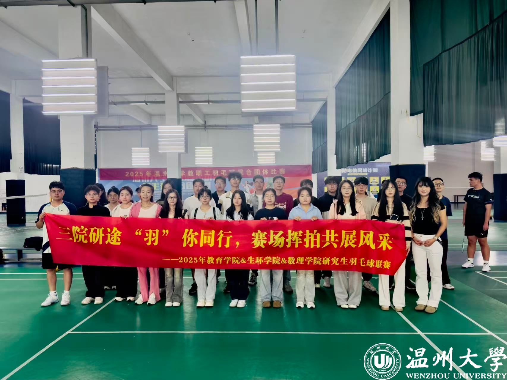 2025年11月1日,由温州大学教育学院、生环学院与数理学院联合举办的 “‘羽’你同行,跃享未来”研究生羽毛球联谊赛在南校区体育馆圆满落下帷幕。本次比赛吸引了三院众多研究生学子踊跃参与,他们在赛场上挥洒汗水、切磋技艺,充分展现了温大研究生拼搏进取的青春风采。