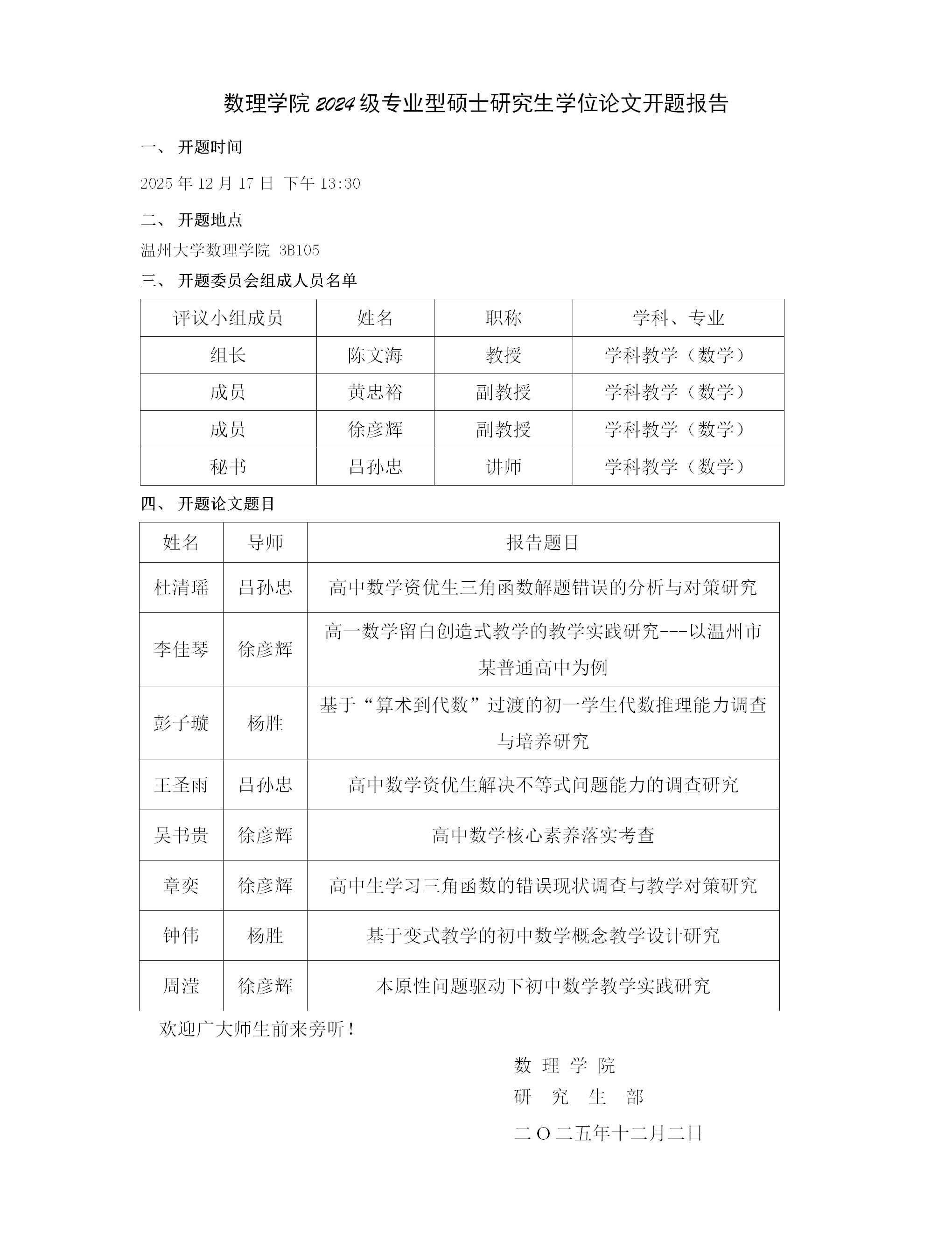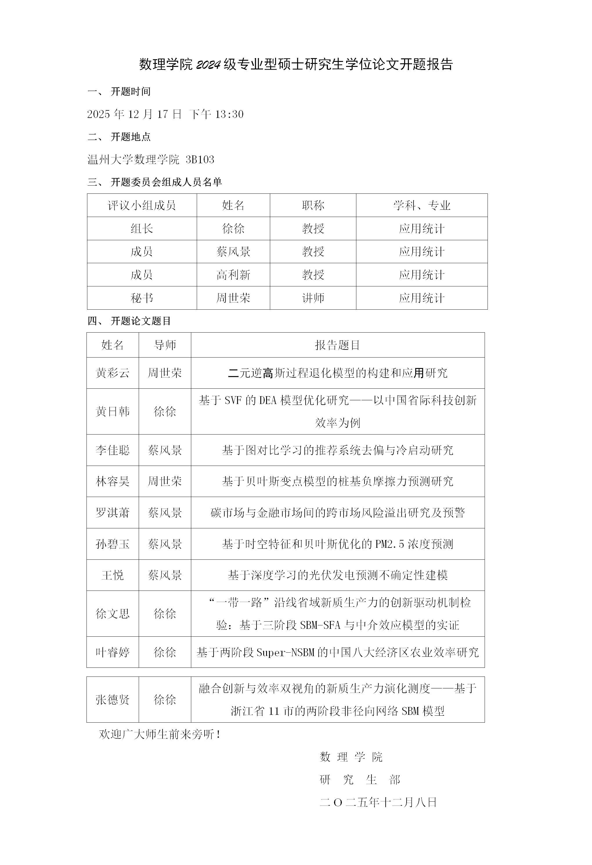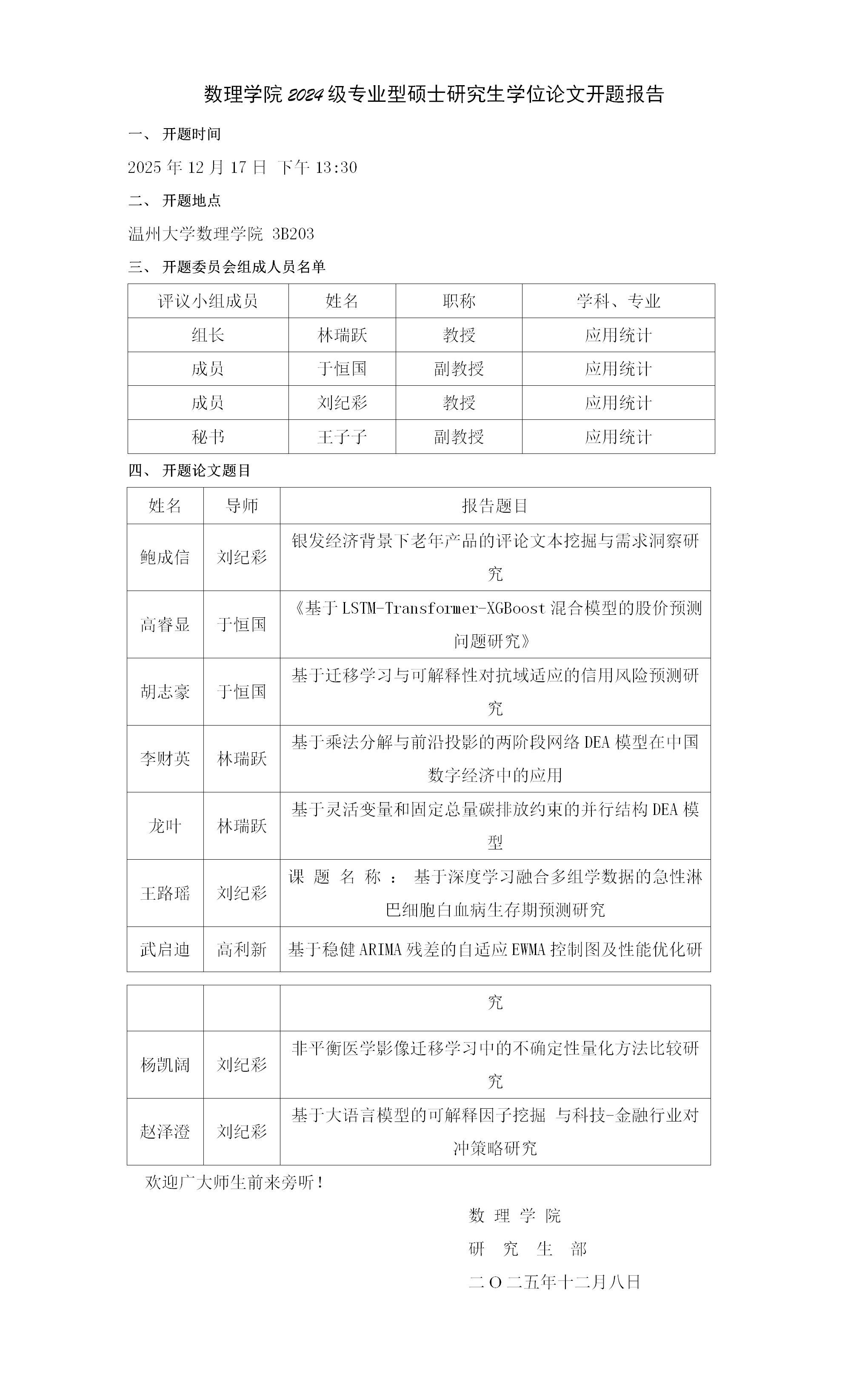 数理学院2024级专业型硕士研究生学位论文开题报告
