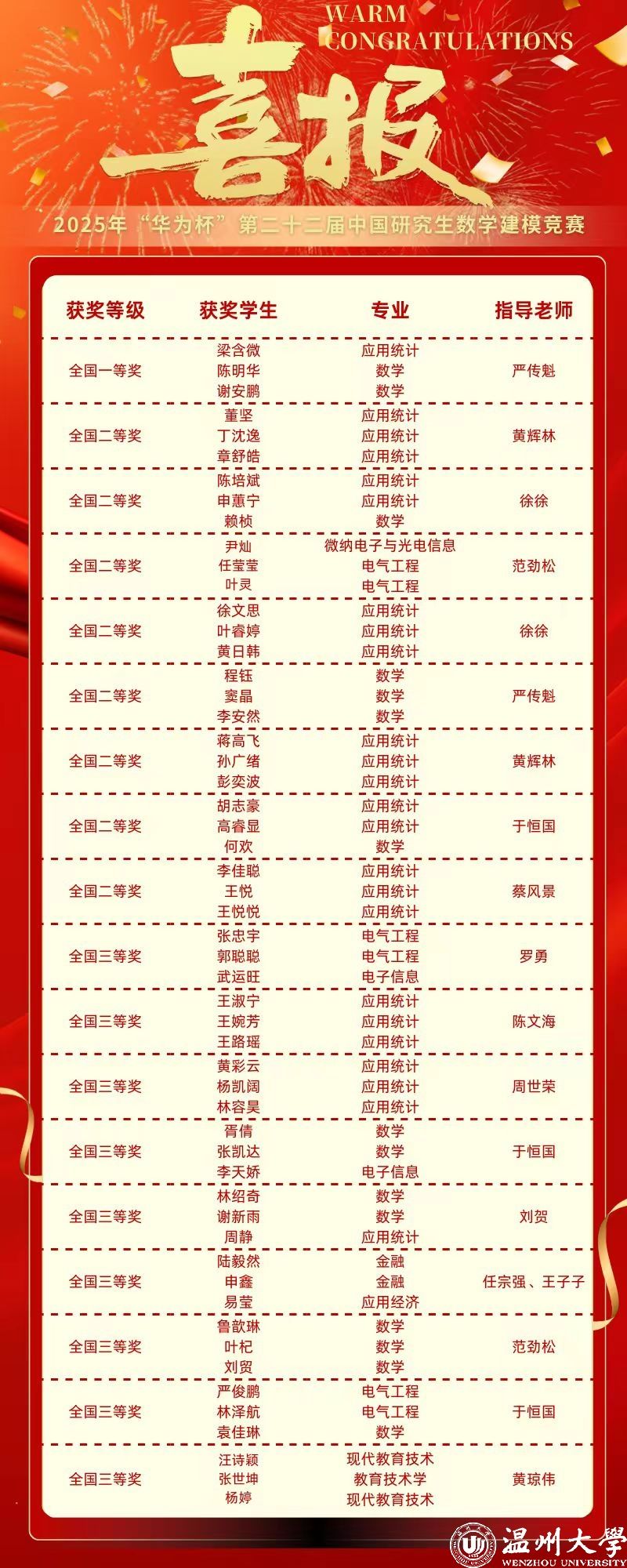 近日,“华为杯”第二十二届中国研究生数学建模竞赛评审结果正式揭晓。我校参赛师生凭借扎实的学科积淀凝心聚力,以紧密的团队协同攻坚,在这场备受瞩目的全国高水平学术赛事中成功斩获一等奖1项、二等奖8项、三等奖9项,获奖总数再攀历史新高峰,亮眼战绩尽显我校研究生的创新实践硬实力!特此向所有拼搏奋进的获奖团队及指导老师们致以最热烈的祝贺!