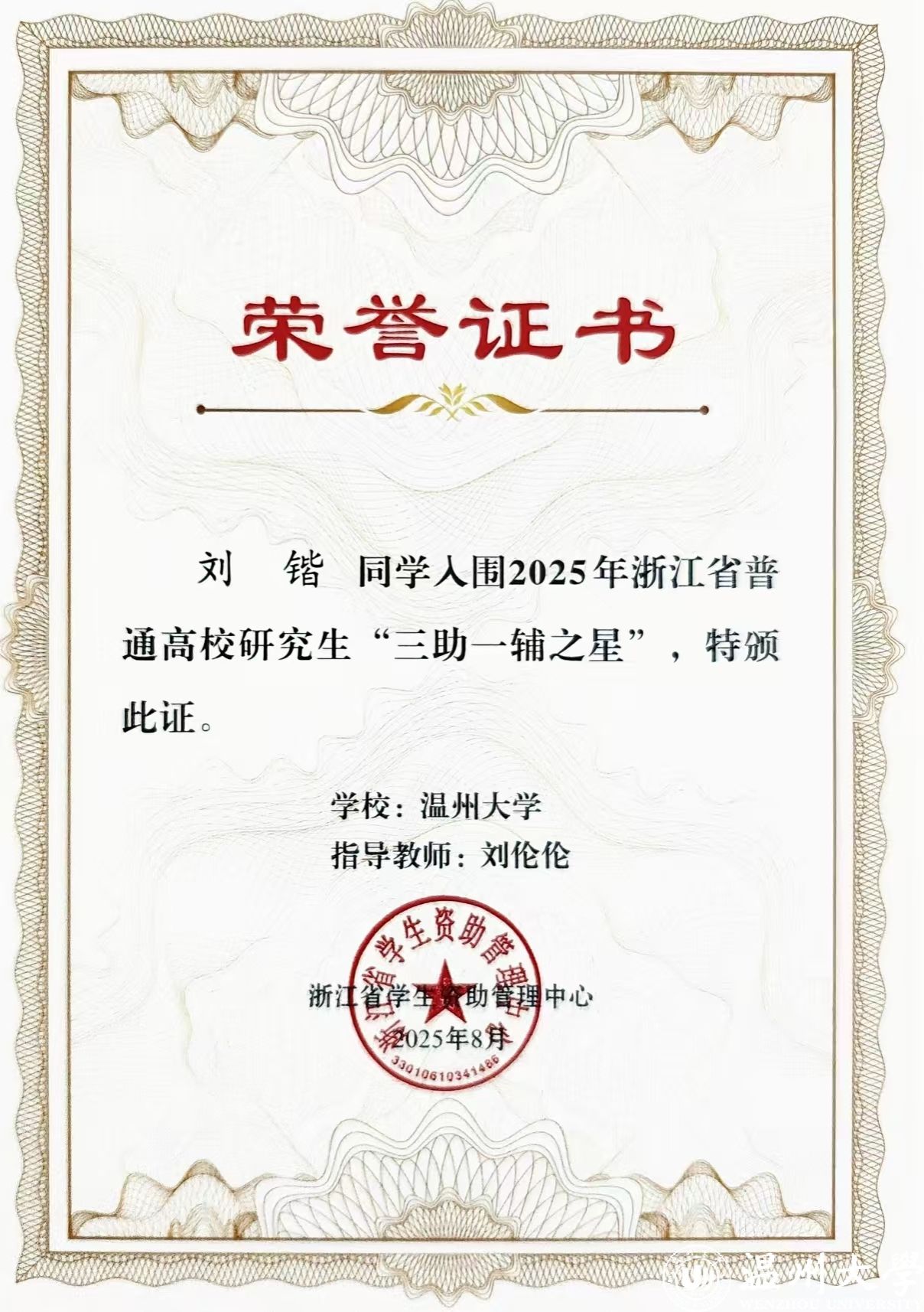 近日,浙江省学生资助管理中心下发《关于公布“助学·筑梦·铸人”2025年浙江省普通高校“勤工助学之星”“三助一辅之星”名单的通知》文件中,我院刘锴同学入围2025年浙江省普通高校研究生“三助一辅之星”,彰显了我院学子努力进取,勇于担当的精神风貌。